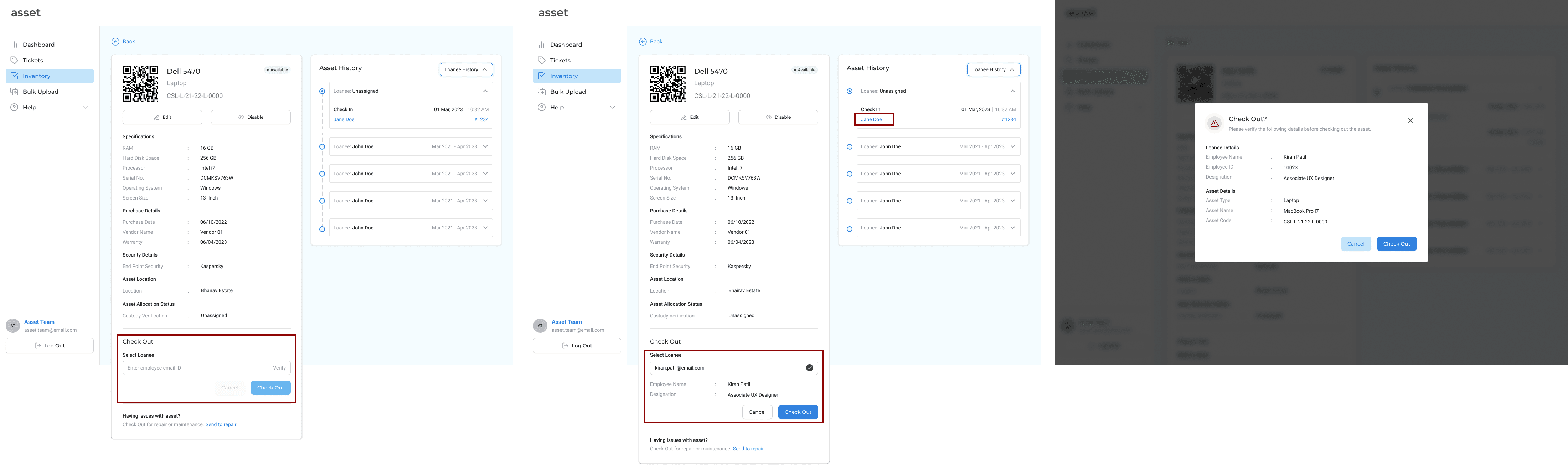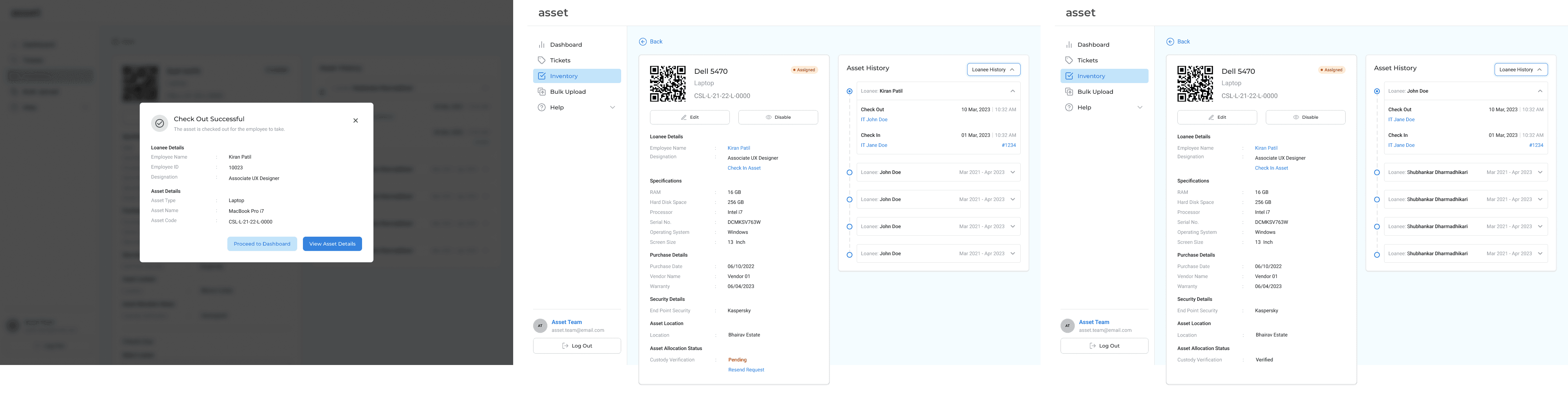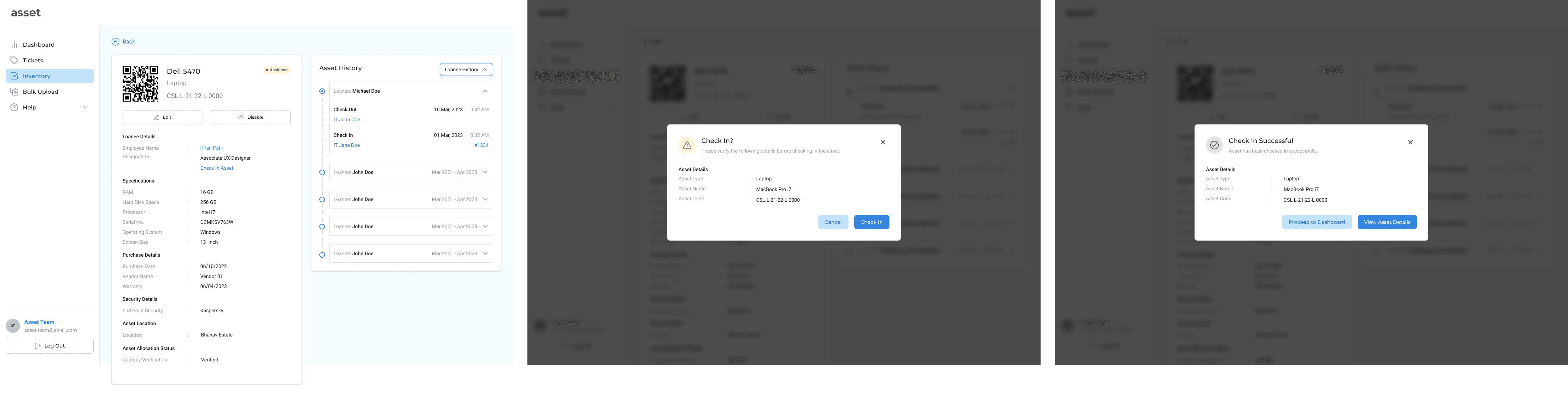 When an asset is ready to be assigned to an employee, the IT team member can check out the asset. This can only be done once the name of the employee has been verified against the list of the names of the employees uploaded by an Asset Manager. The IT member who checks out the asset has been hyperlinked to make it possible to track the reason of check in and check out of the asset in case of any discrepancies.
