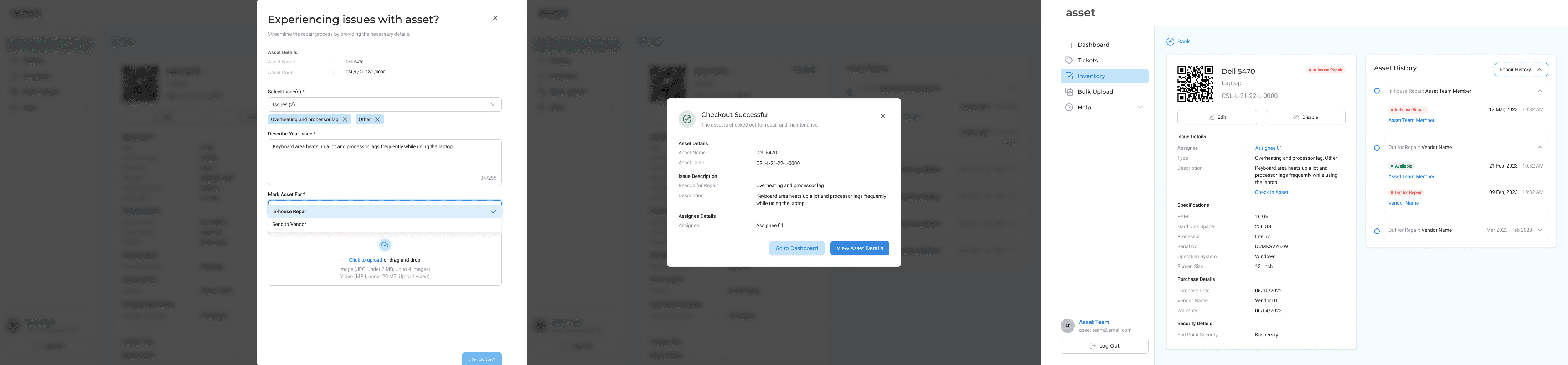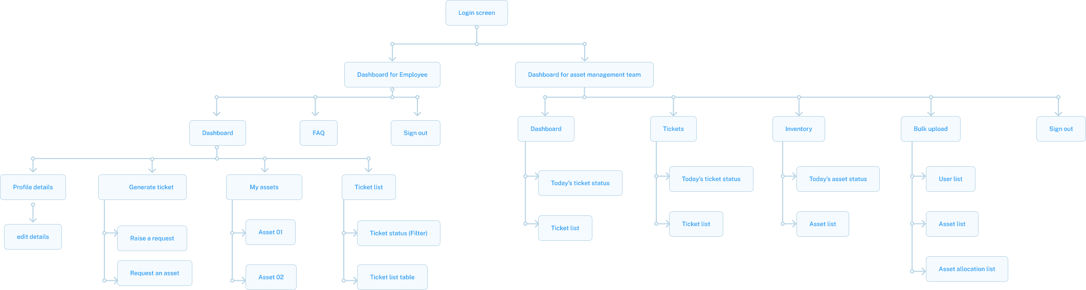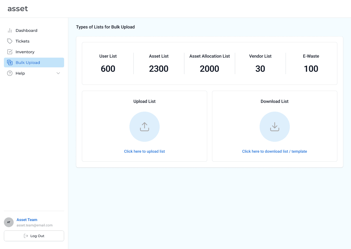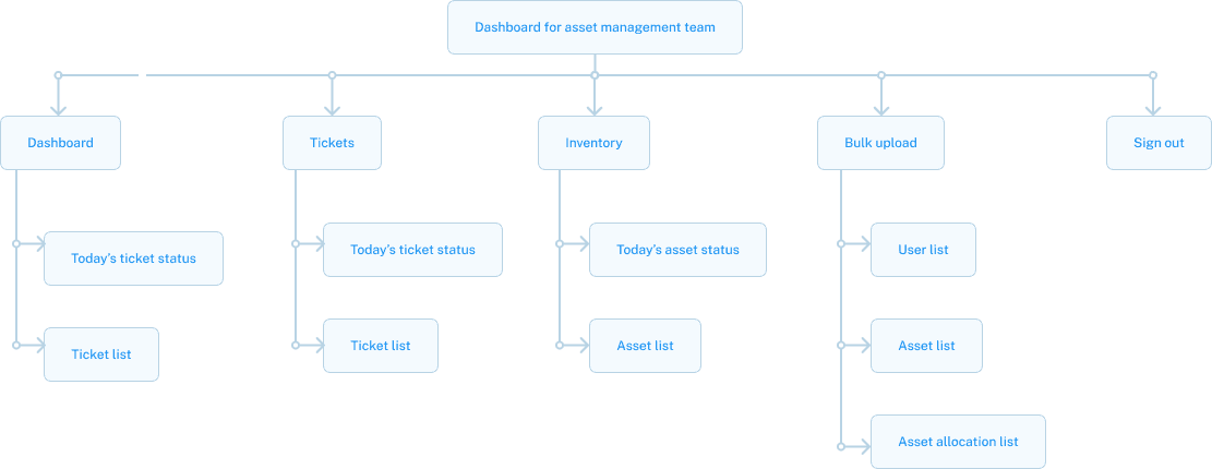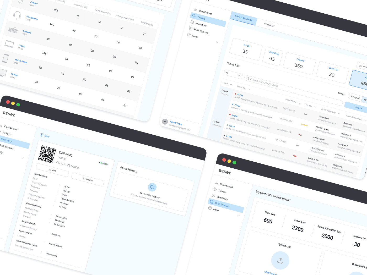 A webapp wherein asset team members can inventorize, manage and track assets and employees can raise issues they face with a particular asset. The Asset team would work with a dashboard that would display all relevant information to the asset and tickets. A section was added to bulk upload all information relating to assets and employees.