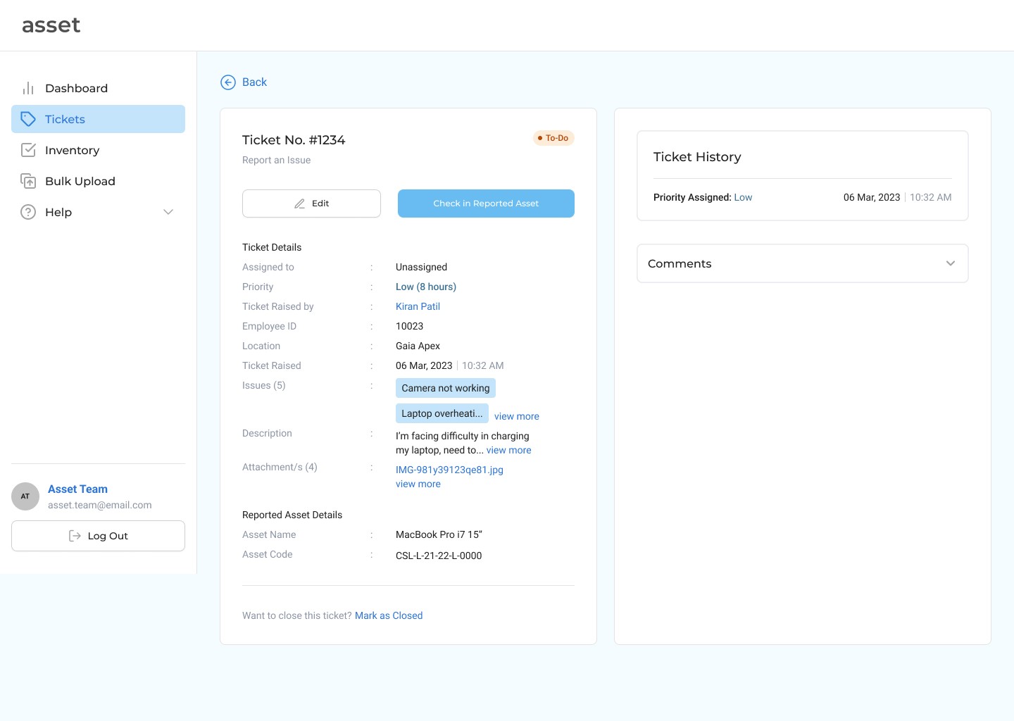 When an employee first raises an issue pertaining to their asset, the ticket shows up on the tickets list of the ticket dashboard of the IT employee. On clicking on the ticket, a detailed view opens up listing all the important details. All members of the IT department have access to the list of tickets and can assign themselves or anyone else to solve the ticket. This was done to improve transparency and communication among the IT employees.