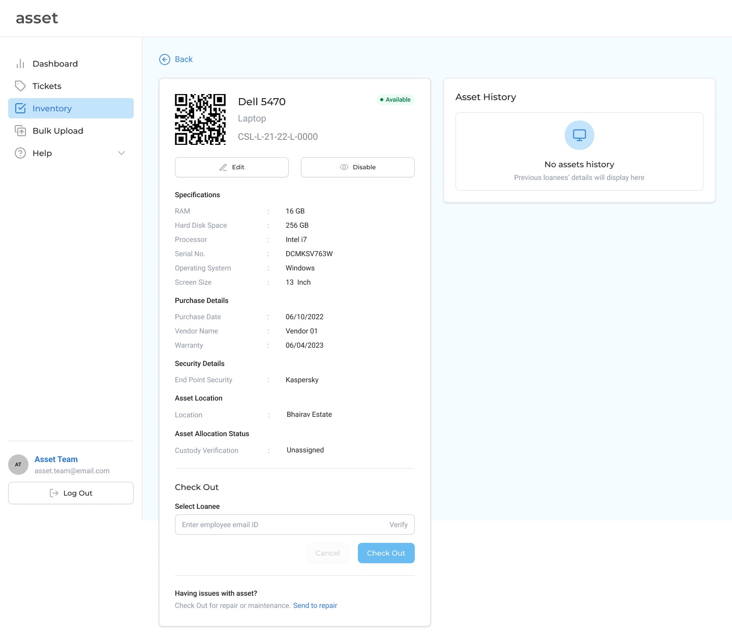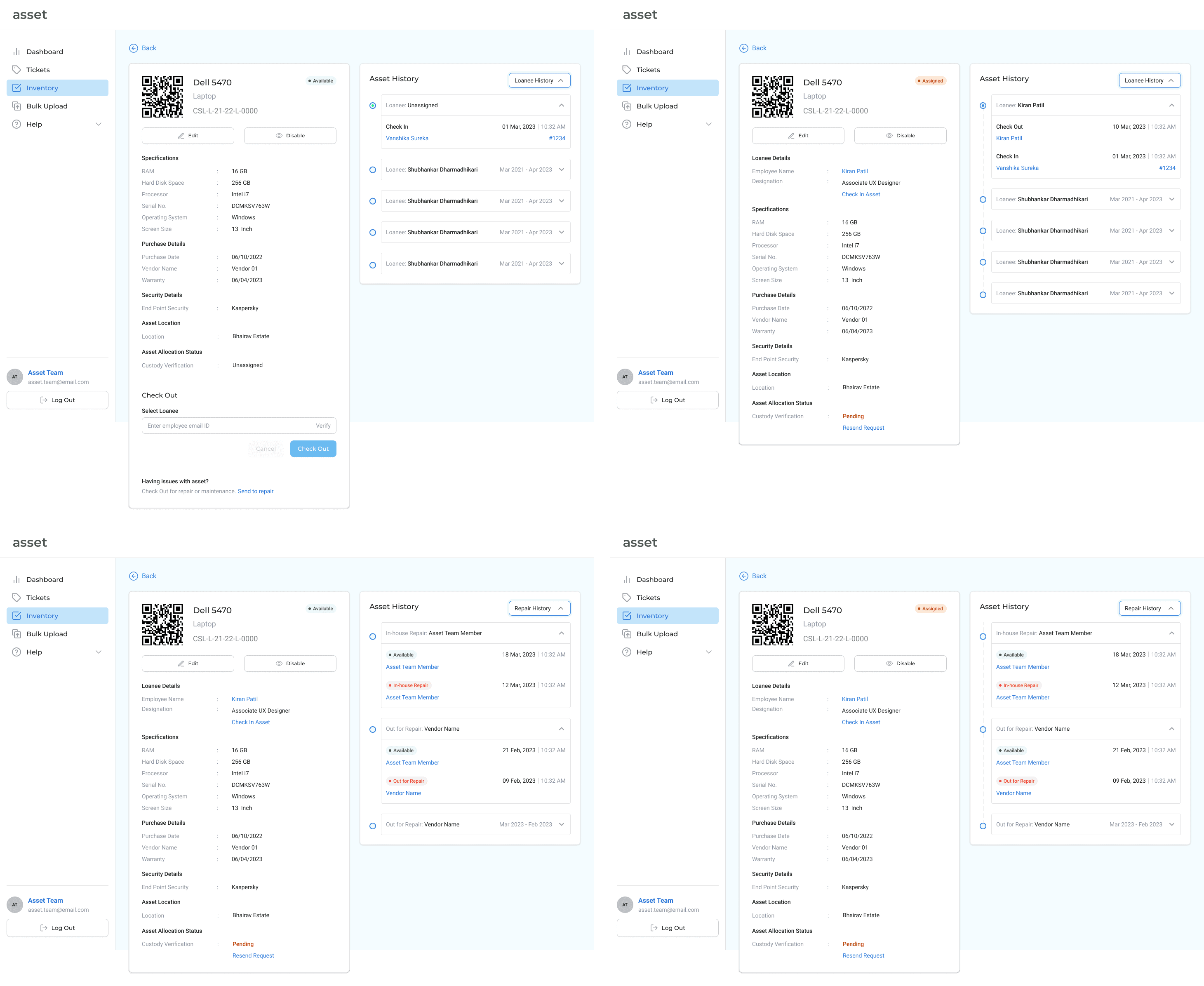 There are four variations for the Asset History section. A tag on the asset details page verifies whether it has been assigned or is available to be assigned to an employee. The dropdown helps IT team members to toggle between loanee history and repair history.