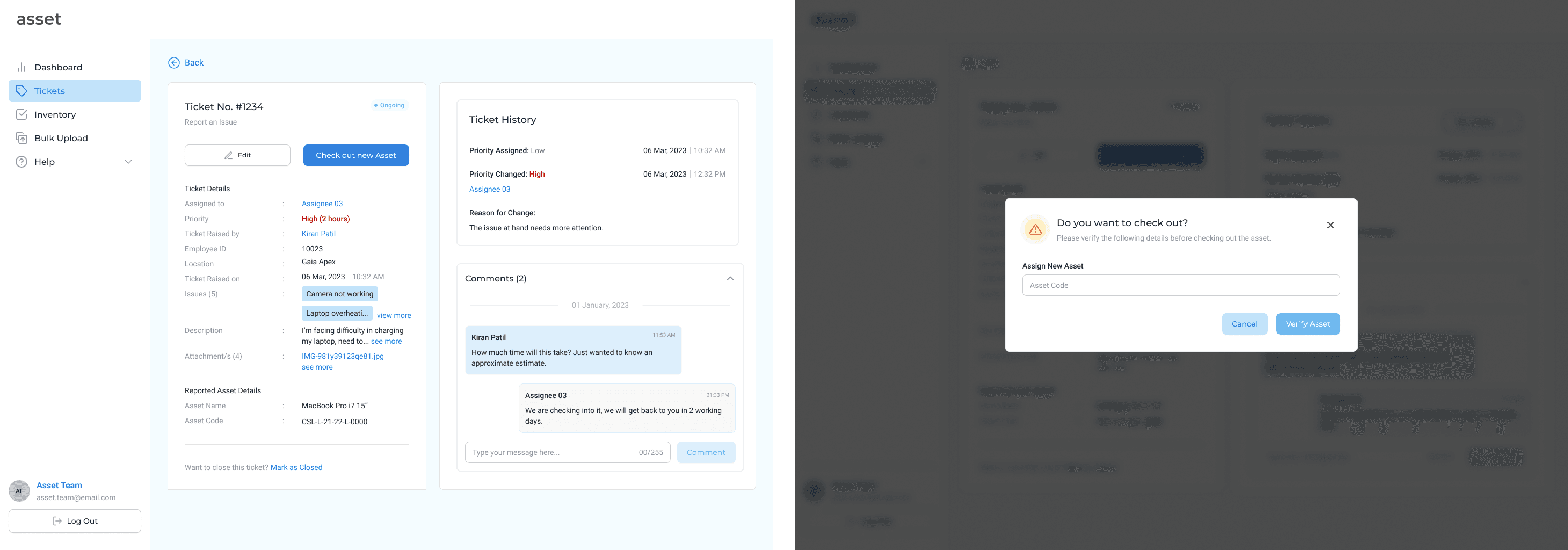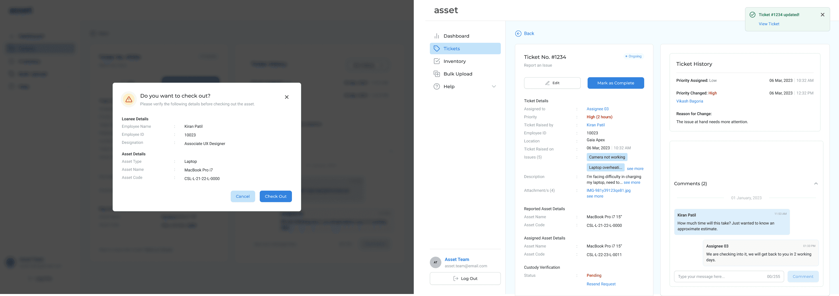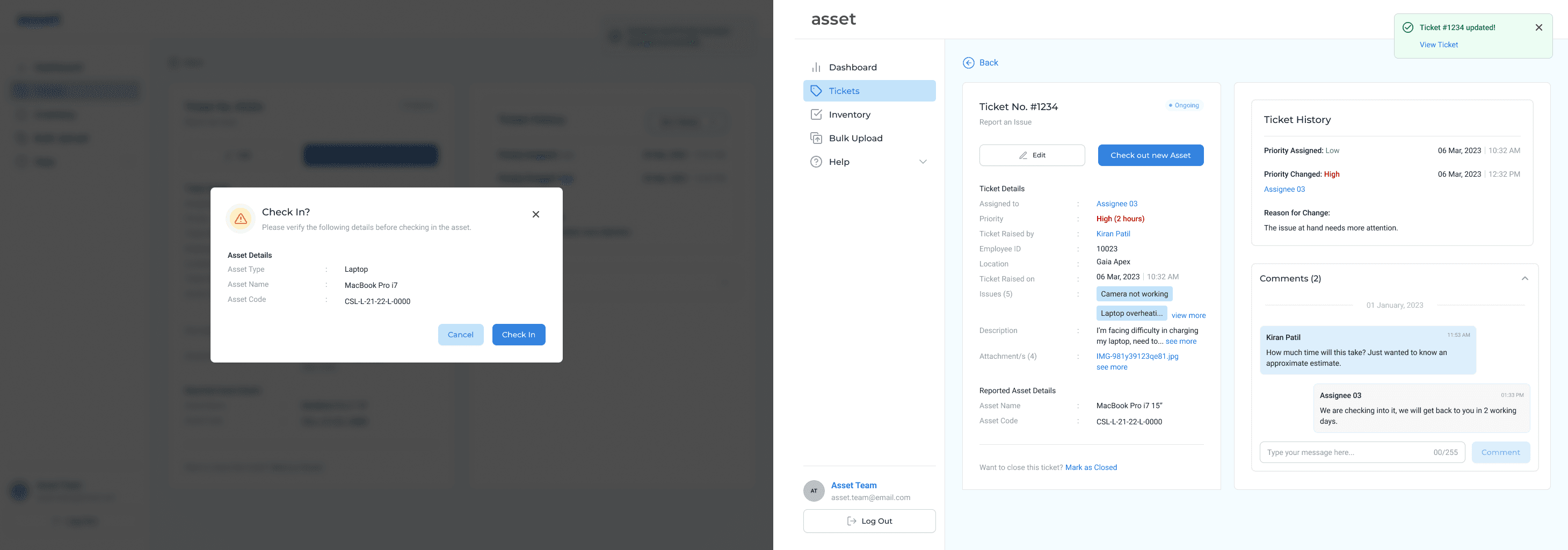 Once they check-in an asset, the ticket details section updates, to provide an option for the IT employee to check out an asset to enable the employee to resume work uninterrupted.