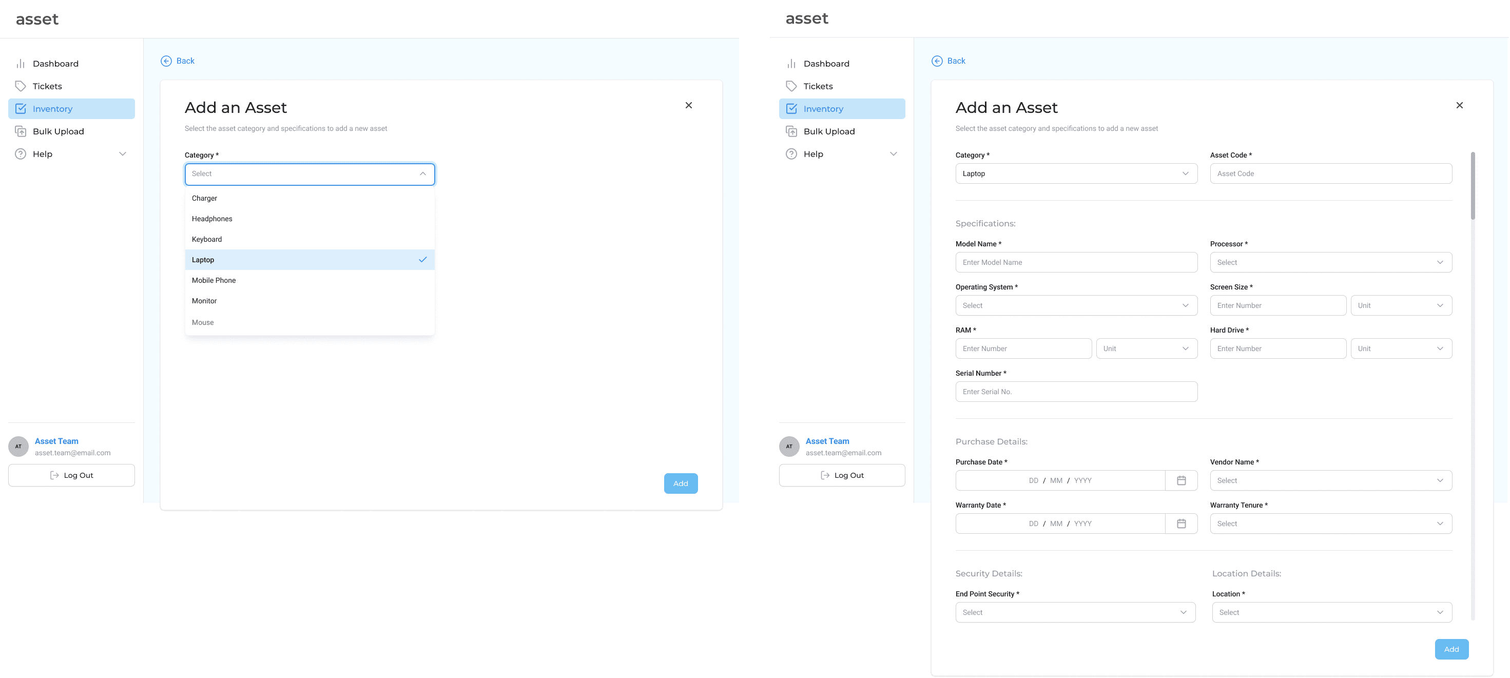 I then switched to a form format that users would have to fill up in order to add an asset to the existing inventory. Since Asset tags were already in place in SMBs, the IT employee would merely have to input the Unique Asset ID. The form displayed relevant fields according to the Asset Category the user chooses. But individually adding assets to the inventory posed a grave question :