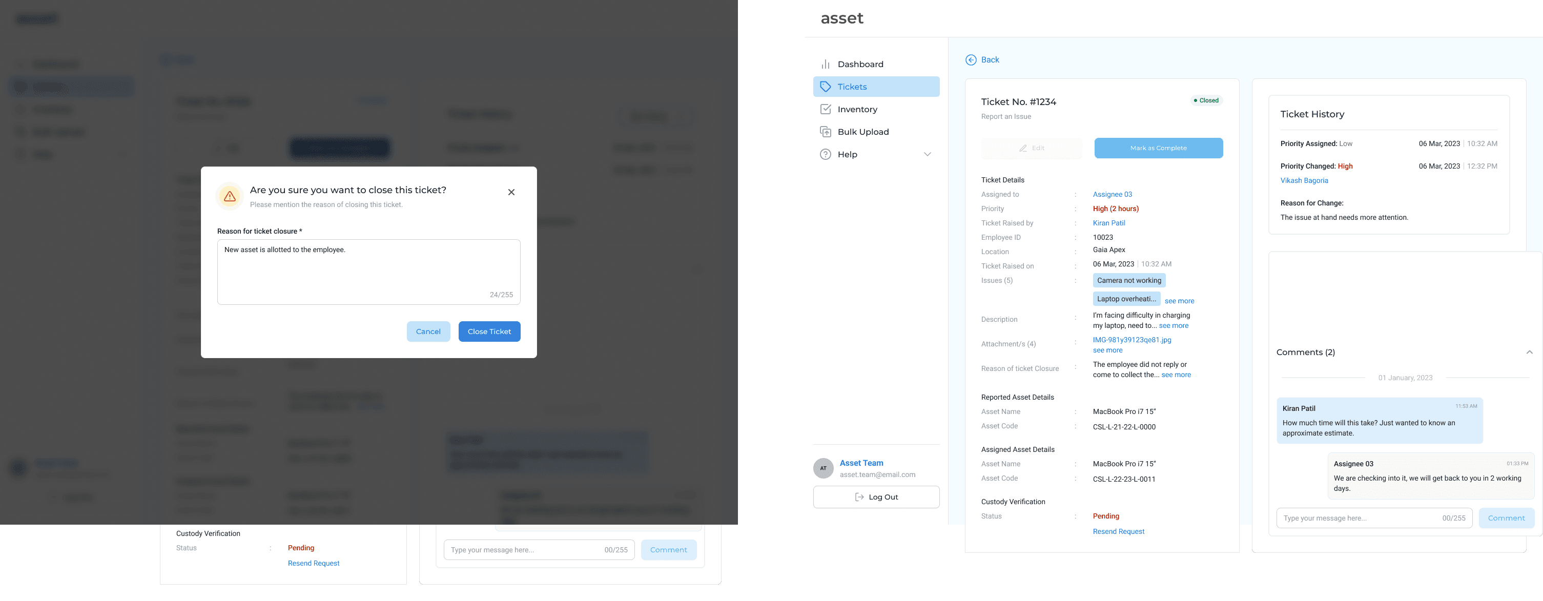 Once the IT team member is finished with the task at hand, they can close the ticket to quickly move on to the next ticket. They can still view the details of the closed ticket to verify custody verification and audit the tickets in the end.